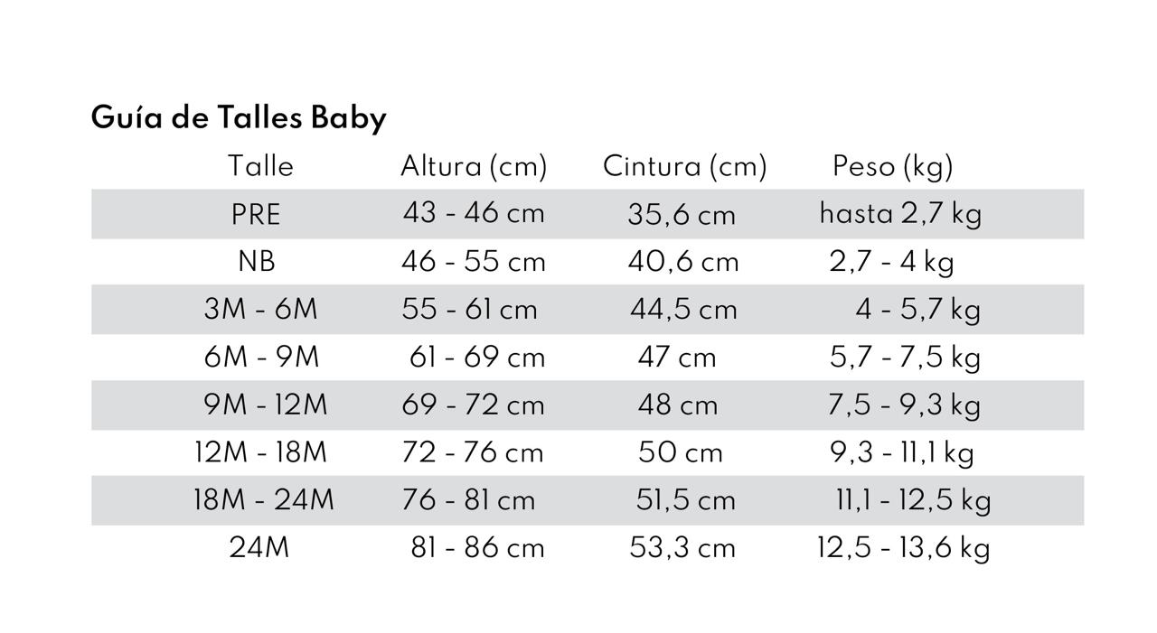 Las prendas de bebé se tabulan por peso y altura. Tené en cuenta que cada bebé es diferente — si tu bebé es más grandito para su edad, subí un talle.